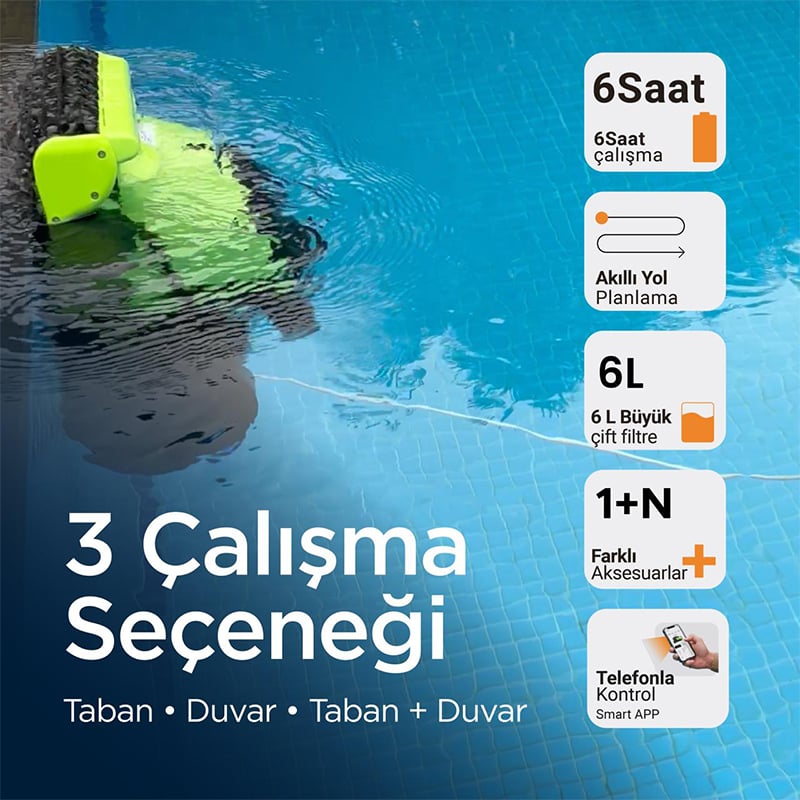 Taban, duvar ve su çizgisi temizliği yapan kablosuz bir robottur. Uzun çalışma süresi ve uzaktan kumanda veya mobil uygulama ile kolay kontrol özelliği sayesinde profesyoneller için güçlü bir çözümdür.