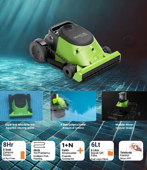 Goodrob King 500 havuz temizlik robotu, kablosuz tasarımı, güçlü motoru ve akıllı navigasyon sistemi ile havuz tabanı, duvar ve su çizgisinde etkili temizlik sağlar. Uzun pil ömrü ve mobil kontrol özellikleri ile profesyonel kullanım için idealdir.